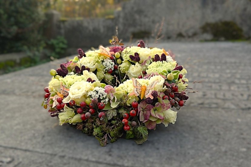 Een rond gestoken afscheidskransje met herfst en winterse materialen. Dit kransje heeft een diameter van 30 cm. en is in diverse afmetingen te maken. Oneindig verbonden in liefde een symbool van respect en herinnering. De cirkel kan de eeuwige verbondenheid met de overledene of de kringloop van het leven niet verbreken.