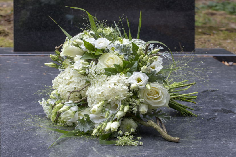 Troostboeket Zuiver bescheiden, een mooie manier om te zeggen ik wens je veel kracht en wijsheid. Een spontaan rond gebonden Troostboeket met een mooie mix van witte gemengde bloemen, liggend in het bos op de begraafplaats Rusthof Leusden.