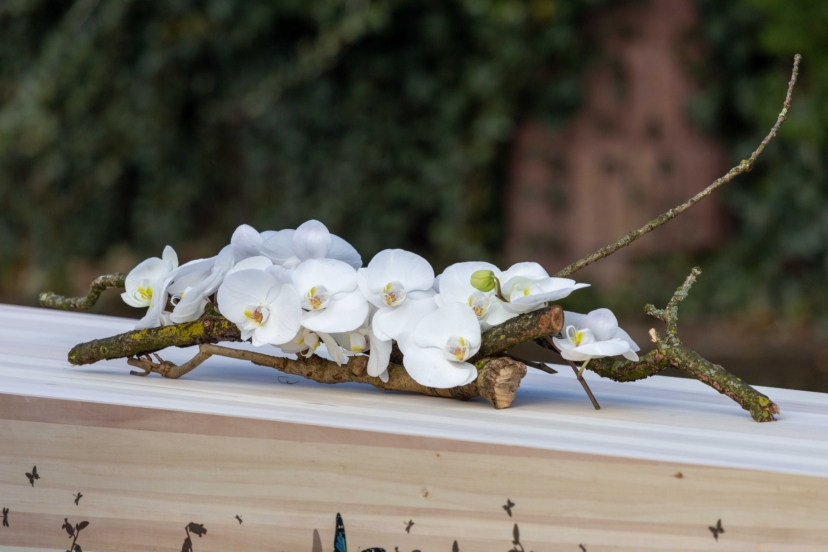 Intens verbonden een sober gebonden afscheidsboeket met witte Phaleanopsis orchideeën op een basis van snoeitakken uit de eigen tuin, ieder het seizoen is het weer verrassend om te maken. Het is een ongedwongen manier van medeleven betonen en minder formeel dan een echt rouwboeket. Bedoeld om tijdens de afscheidsceremonie te laten weten wij denken aan jullie.