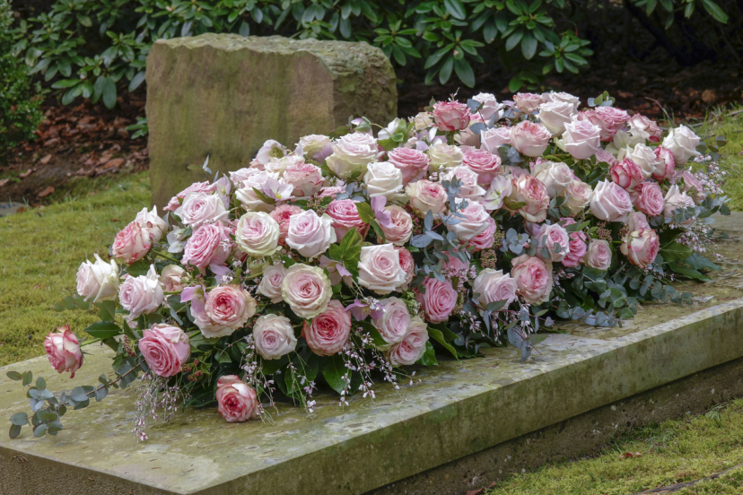 Royaal gestoken kistbedekking in pasteltinten met als basis een mooie verzameling grootbloemige gemengde roze rozen. Deze volledige kistbedekking heeft een lengte van 180 cm. en vult de gehele deksel van de uitvaartkist. In overleg is deze kistbedekking in diverse kleuren combinaties te maken.